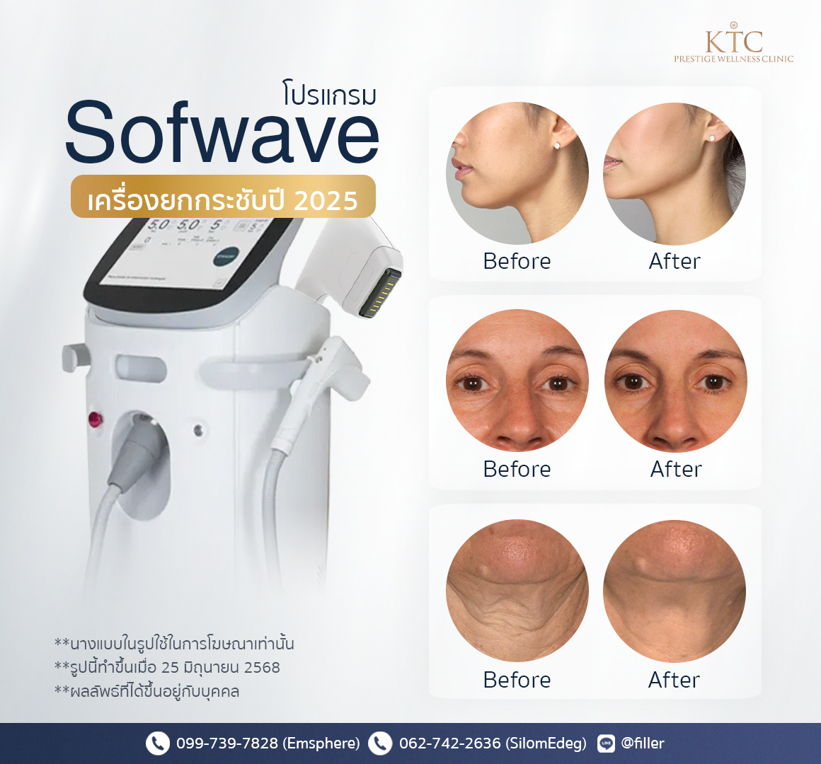 | โปรแกรม Sofwave | Micro-Focused Ultrasound (MFU) | เจ็บน้อย ฟื้นตัวเร็ว | ยกกระชับผิวชั้นกลาง เหมาะกับผิวบอบบาง |
