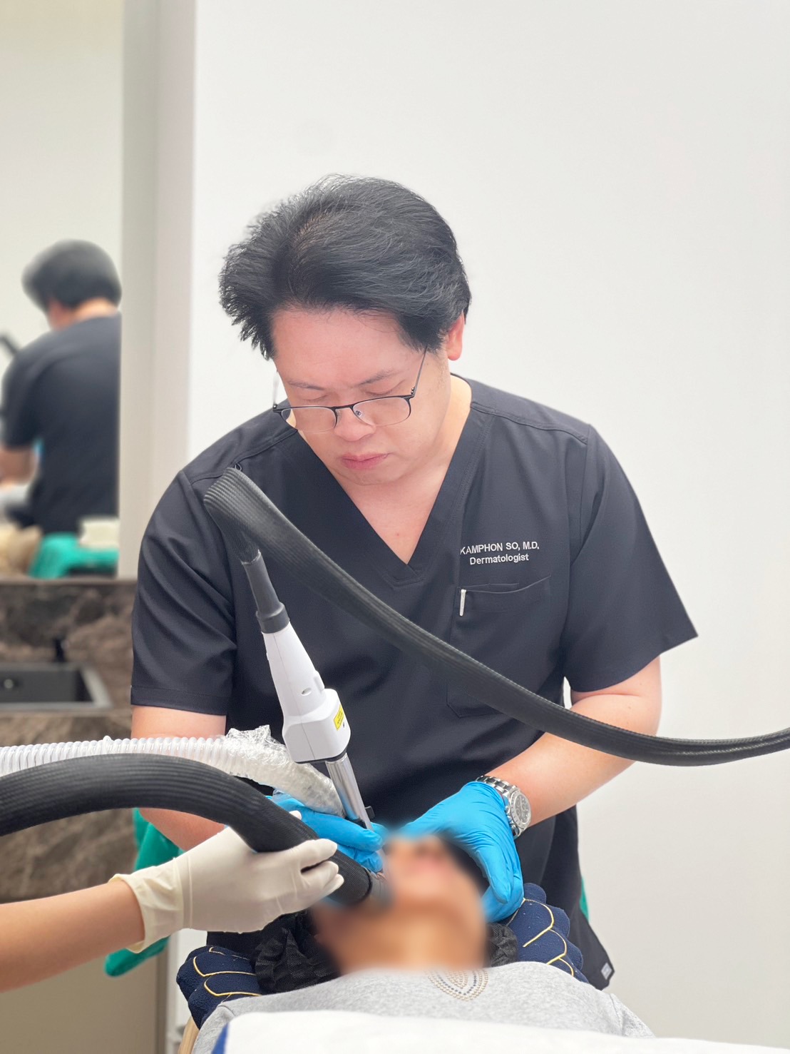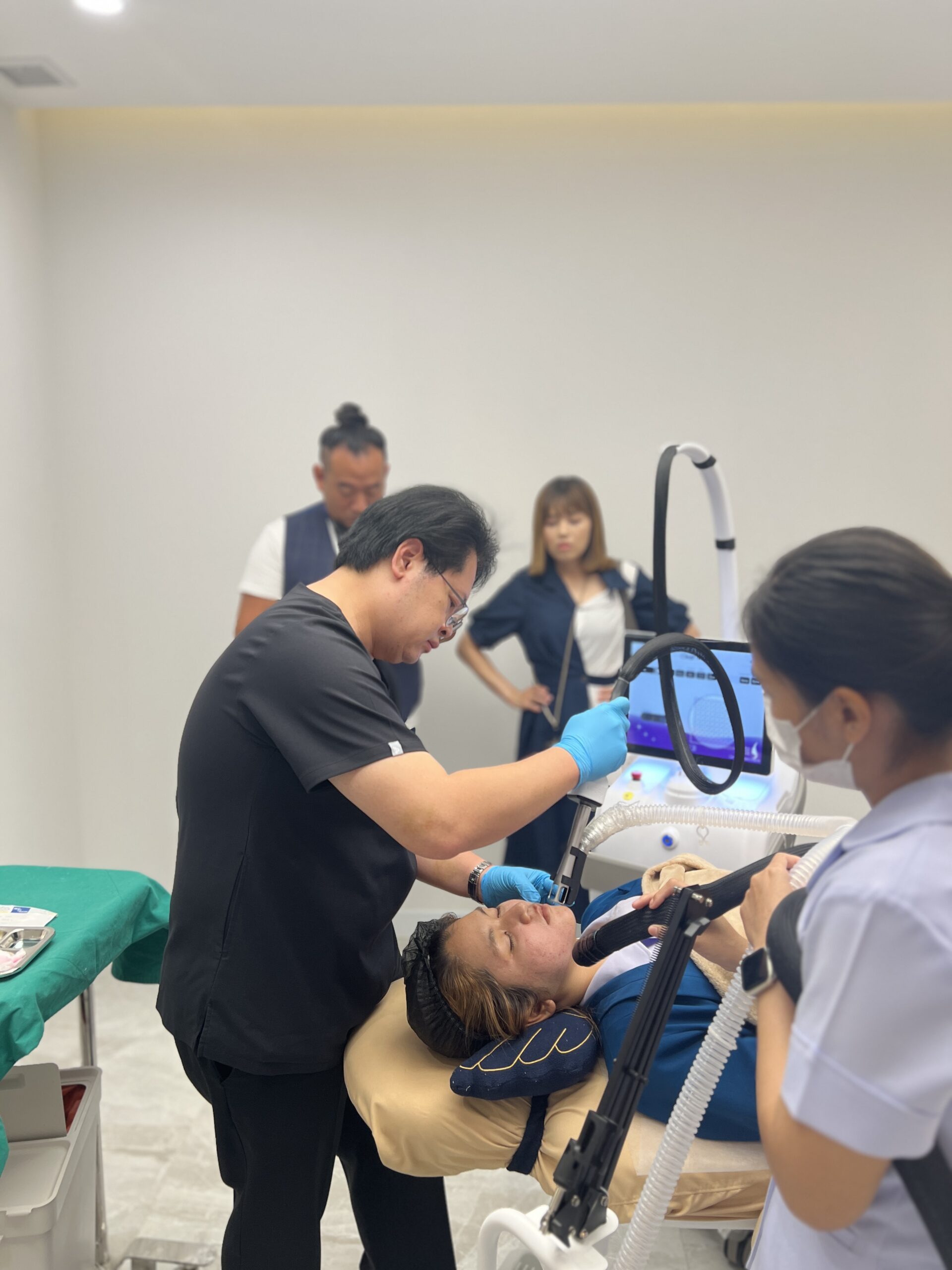 เริ่มเลเซอร์: ยิงเลเซอร์ทั่วทั้งใบหน้า โดยแพทย์จะเลือกใช้โหมดต่าง ๆ (Coring, Ultra และ Clear) ตามสภาพผิวและปัญหาเฉพาะบุคคล